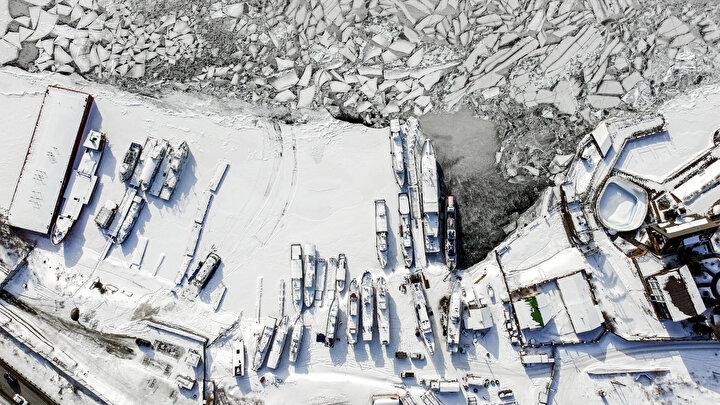 Listvyanka kentinde buz kütlelerinin kapladığı gölün limanında, gemiler ve botlar baharın gelmesini ve donan gölde buzların çözülmesini bekliyor.