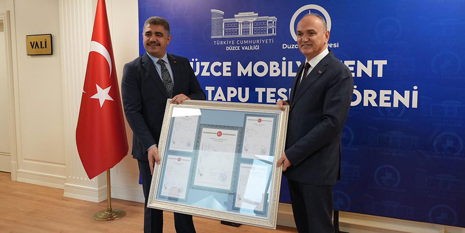 Arazilerin arsa tapularının devri için ilk imzalar Düzce Belediye Başkanı Dr. Faruk Özlü ile Çevre, Şehircilik ve İklim Değişikliği İl Müdürü Nurhan Kartal arasında atılırken tapu teslim töreni Düzce Valisi Selçuk Aslan ve Başkan Dr. Faruk Özlü’nün katılımı ile yapıldı. 5 parçadan oluşan ve toplam değeri 90 Milyon TL olan araziler artık Düzce Belediyesi taşınmazları arasına girdi.