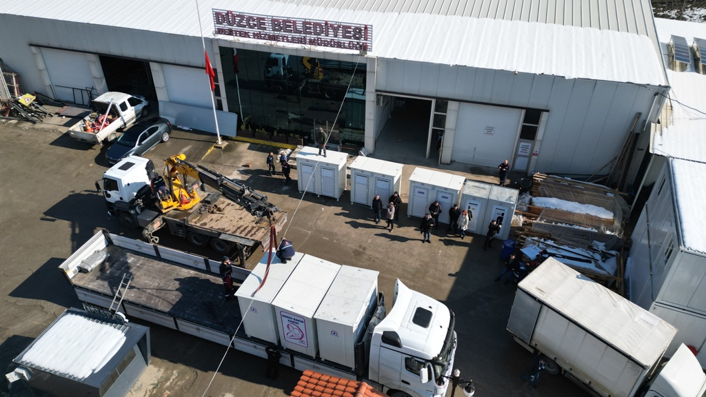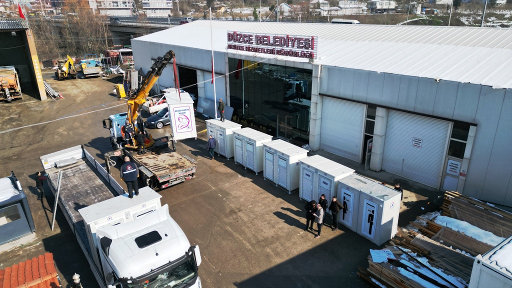 Düzce Belediyesinin öz kaynakları kullanılarak üretime geçilen lavabo ve tuvaletlerden 10 adedi Cumartesi günü Elbistan'a gönderilmişti. Bir yandan sevkiyat sürerken diğer yandan üretime devam eden Destek Hizmetleri Müdürlüğü ekipleri, 8 tuvalet, 1 bebek bakım odasının imalatını tamamlayarak yola çıkardı. Tuvaletler ile birlikte 40 adet de soba da depremzedelerin kullanılması için Elbistan'a gönderildi.