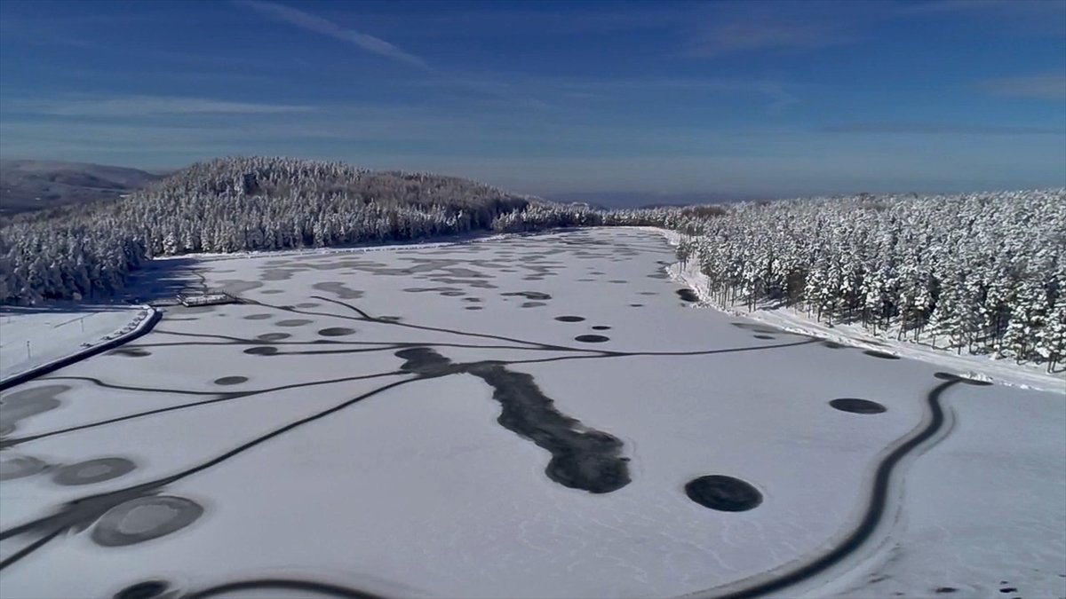 Düzce'nin Kaynaşlı ilçesinde bulunan, 1300 rakımlı Topuk Yaylası'nda hava sıcaklığı, eksi 7 dereceye düştü.Soğuk havanın etkisiyle ise, yaylada bulunan göletin yüzeyi buza dönüştü.