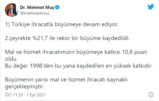 Ticaret Bakanı Mehmet Muş, yılın ikinci çeyreğinde yüzde 21.7 oranında büyüyen ekonomiye ilişkin Twitter üzerinden açıklamalarda bulundu. Bakan Muş "Türkiye ihracatla büyümeye devam ediyor. 2.çeyrekte %21,7 ile rekor bir büyüme kaydedildi. Mal ve hizmet ihracatımızın büyümeye katkısı 10,8 puan oldu. Bu değer 1998'den bu yana kaydedilen en yüksek katkıdır. Büyümenin yarısı mal ve hizmet ihracatı kaynaklı gerçekleşmiştir." dedi.