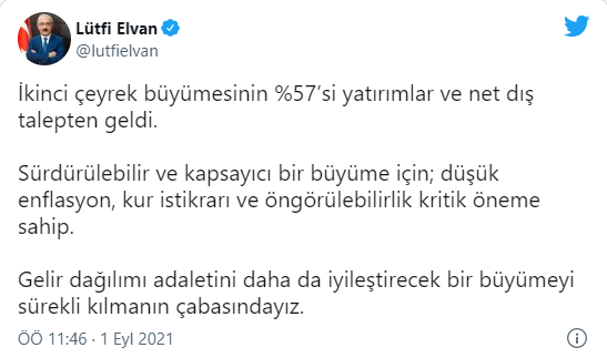 Büyüme rakamlarını değerlendiren Hazine ve Maliye Bakanı Lütfi Elvan, Twitter hesabından yaptığı açıklamada "İkinci çeyrek büyümesinin %57’si yatırımlar ve net dış talepten geldi. Sürdürülebilir ve kapsayıcı bir büyüme için; düşük enflasyon, kur istikrarı ve öngörülebilirlik kritik öneme sahip. Gelir dağılımı adaletini daha da iyileştirecek bir büyümeyi sürekli kılmanın çabasındayız" ifadelerini kullandı.