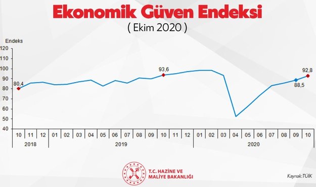 Ekonomik Güven Endeksi, Türkiye İstatistik Kurumu (TÜİK) tarafından yayınlanan verilere göre Eylül ayında yüzde 88,5 oranında kaldı. Bu yüzde oranı Ekim ayında 92,8'e yükseldi. Bakan Berat Albayrak, söz konusu verileri paylaşarak, "Farklı siyasi saiklerle bir olup battık, bittik yaygarasıyla algı oluşturmaya çalışanlara inat, ekonomimize güven artıyor." ifadelerini kullandı.