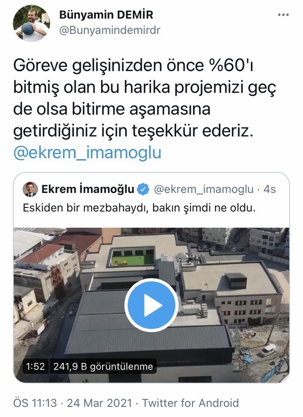 Güngören Belediye Başkanı Bünyamir Demir de, Ekrem İmamoğlu'nun eleştirdi ve "Göreve gelişinizden önce yüzde 60'ı bitmiş olan bu harika projemizi geç de olsa bitirme aşamasına getirdiğiniz için teşekkür ederiz" ifadelerini kullandı.