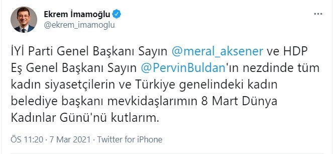 Sosyal medya hesabından İYİ Parti Genel Başkanı Meral Akşener ve HDP Eş Genel Başkanı Pervin Buldan’ın kadınlar gününü kutlayarak muhalif kesimin bile tepkisi üzerine çeken CHP’li İBB Başkanı Ekrem İmamoğlu şimdi de HDP Eş Genel Başkanı Pervin Buldan’ı arayarak Nevruz Bayramı’nı kutladı.