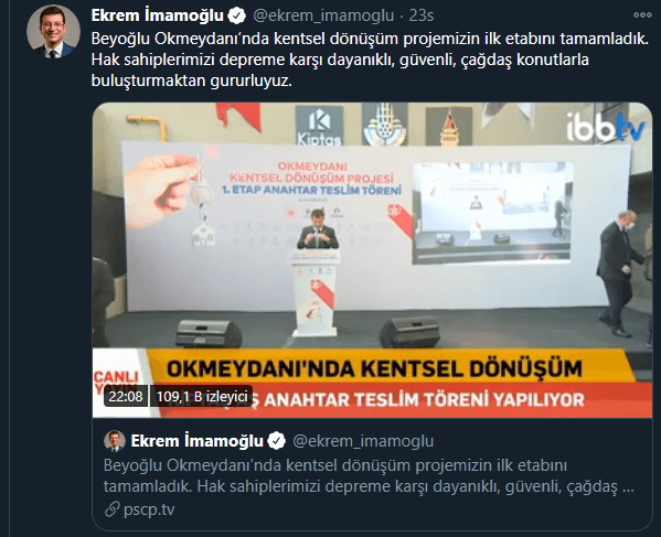 İBB başkanı Ekrem İmamoğlu sosyal medya hesabı Twitter üzerinden yaptığı açıklamayla söz konusu projeyi kendisine aitmiş gibi gösterdi. İmamoğlu, Beyoğlu Okmeydanı kentsel dönüşüm projesinin ilk etabının tamamlandığını ve anahtarların vatandaşlara teslim edildiğini belirtti. Ayrıca İmamoğlu, bu konuya ilişkin herkesin hızlıca hareket etmek zorunda olduğunu ifade etti. Ancak imamoğlu'nun bu yalanı da tıpkı diğer yalanları gibi kısa bir sürede ortaya çıktı.