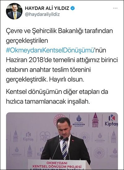 Okmeydanı'nın orada yaşayan vatandaşlara ait olduğunu vurgulayan Yıldız, o vatandaşların Okmeydanı haricinde başka bir yere gönderilmeyeceklerinin altını çizmiş, kentsel dönüşümün yerinde olacağını tekrar hatırlatmıştı.