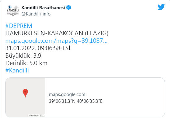Hamurkesen-Karakoçan bölgesinde 3,9 şiddetinde bir deprem meydana geldi.