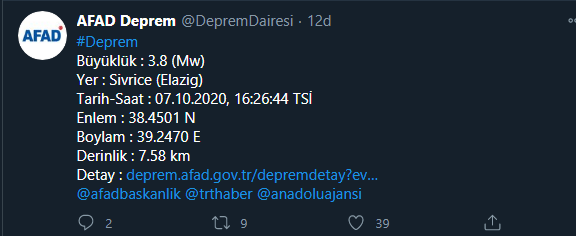 AFAD tarafından yapılan son açıklamaya göre, üssünün Sivrice olduğu belirlenen Elazığ'da 3.8 şiddetinde bir deprem meydana geldi. Deprem 16:26 saatinde meydana geldi ve şiddeti Erzincan, Malatya ve Gaziantep gibi şehirlerdeki vatandaşlar tarafından hissedildi. Depremde herhangi bir can ve mal kaybı kayıtlara geçmedi. İşte AFAD tarafından yapılan son dakika açıklaması;