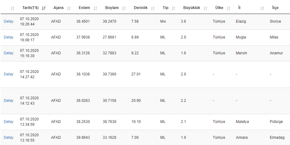 AFAD SON DEPREMLER LİSTESİ