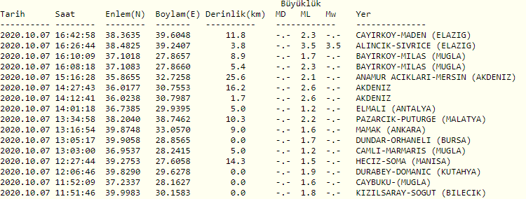 KANDİLLİ RASATHANESİ SON DEPREMLER LİSTESİ