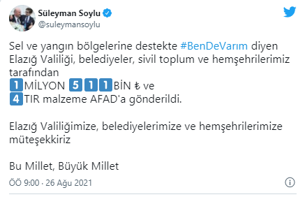 İçişleri Bakanı Süleyman Soylu, Elazığ'dan sel ve yangın bölgelerine yapılan yardımları sosyal medya hesabından paylaştı. Bakan Soylu, "Sel ve yangın bölgelerine destekte ben de varım diyen Elazığ valiliği, belediyeler, sivil toplum ve hemşehrilerimiz tarafından 1 milyon 511 bin lira ve 4 tır malzeme AFAD'a gönderildi. Elazığ Valiliğimize, belediyelerimize ve hemşehrilerimize müteşekkiriz. Bu millet, büyük millet" açıklamalarında bulundu.