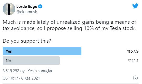 Ünlü milyarder Elon Musk'ın elindeki Tesla hisselerinin yüzde 10'unu satıp satmama konusunda Twitter'da açtığı anket sonuçlandı. Musk, Twitter'daki 62.8 milyon takipçisine "Elon Musk Twitter üzerinden açtığı ankette "Realize edilmemiş sermaye kazançlarının vergi kaçınmada kullanıldığı son zamanlarda çok konuşuldu. Bu yüzden Tesla hisselerimin yüzde 10'unu satmayı teklif ediyorum. Bunu destekliyor musunuz" diye sormuştu.