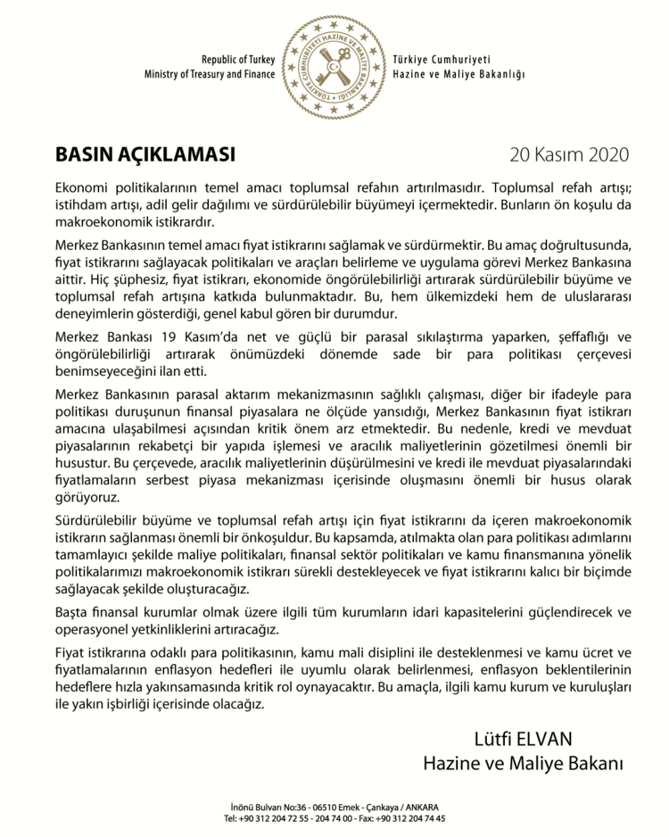 Bakan Elvan, 19 Kasım 2020 tarihinde Merkez Bankası'nın, kuvvetli bir parasal sıkılaştırma yaptığını ve bunu yaparken şeffaflıkla ve öngörülebilirlik ile çalıştığını söyleyerek önümüzdeki dönemlerde daha sade bir para politikası benimseyeceğini ifade etti.