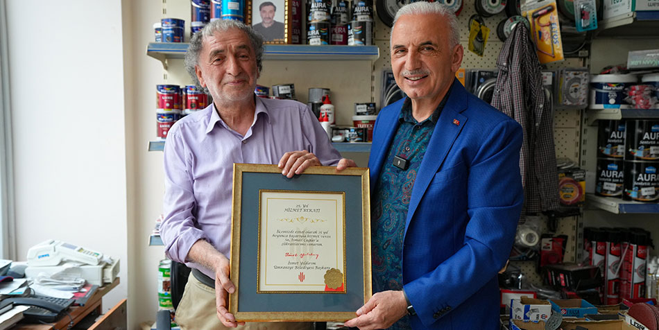 Ümraniye Belediyesi tarafından bugüne kadar hizmette 25. yılını tamamlamış olan 700 esnafa hizmet beratı verildi. Her fırsatta esnafı iş yerlerinde ziyaret ederek, onların talep ve önerilerini dinleyen Başkan İsmet Yıldırım, bu kez de 51 yıldır Namık Kemal Mahallesi’nde nalbur dükkanı işleten İsmail Çağlar’ı ziyaret ederek, hizmet beratını takdim etti.