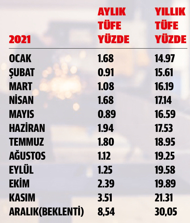 Milyonlarca kişiyi ilgilendiren aralık ayı enflasyon verisi, Türkiye İstatistik Kurumu (TÜİK) tarafından bugün açıklanacak. 2021’in ikinci 6 ayına ait enflasyon oranının netleşmesiyle memur maaşları ile memur emeklilerinin aylıklarına bu yılın ilk altı ayında yapılacak artış oranı ortaya çıkacak. Yaklaşık 3 milyon 500 bin memur ile 2 milyonu aşkın memur emeklisinin merakla beklediği enflasyon farkının ne kadar olacağı sorusunun cevabı, yarın açıklanacak Aralık ayı enflasyonu ile netleşecek.