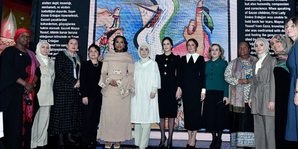 Bugün dünya olarak hiçbir ülkenin tek başına bertaraf edemeyeceği boyutta krizlerle karşı karşıya olduklarını vurgulayan Emine Erdoğan, sözlerini şöyle sürdürdü: "Bizi insanlık olarak bir arada tutan değerlerin ve kurumların temelleri, yakın tarihte hiç bu kadar sarsılmamıştı. Bu buluşmayı, huzurlu bir barış ortamında değil; ne yazık ki, savaşın karanlık gölgesi altında gerçekleştiriyoruz. Savaşlar ve çatışmalar âdeta adım adım ilerleyen bir yangın gibi dünyamızı kuşatmaya devam ediyor. Yanan bizim evimiz, yanan bizim ailemiz, yanan bizim ortak değerlerimiz. Kutuplaşma ve ırkçılığın arttığı, tahammülsüzlük ve tamahkârlığın nefreti körüklediği bir çağda, barışı ve düzeni korumak git gide daha da zorlaşıyor. Adil ve güçlü bir iradenin diplomasiyle çözebileceği ihtilaflar, hızla sıcak çatışmaya evriliyor."