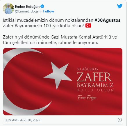 Cumhurbaşkanı Recep Tayyip Erdoğan'ın eşi Emine Erdoğan, sosyal medyadan paylaştığı mesajında, "İstiklal mücadelemizin dönüm noktalarından 30 Ağustos Zafer Bayramı'mızın 100'üncü yılı kutlu olsun. Zaferin yıl dönümünde Gazi Mustafa Kemal Atatürk'ü ve tüm şehitlerimizi minnetle, rahmetle anıyorum." ifadelerini kullandı.