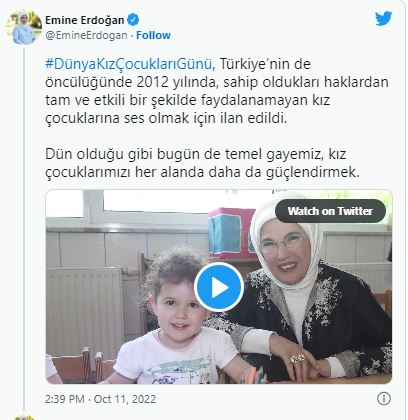 "Dünya Kız Çocukları Günü, Türkiye'nin de öncülüğünde 2012 yılında, sahip oldukları haklardan tam ve etkili bir şekilde faydalanamayan kız çocuklarına ses olmak için ilan edildi. Dün olduğu gibi bugün de temel gayemiz, kız çocuklarımızı her alanda daha da güçlendirmek.