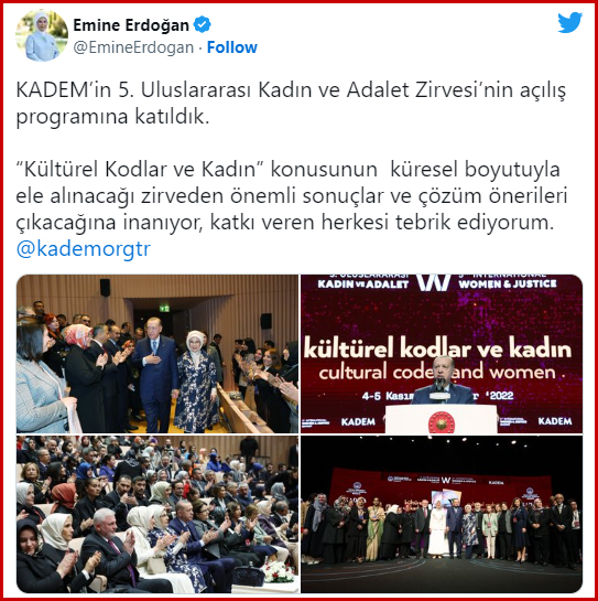"KADEM'in 5. Uluslararası Kadın ve Adalet Zirvesi'nin açılış programına katıldık. 'Kültürel Kodlar ve Kadın' konusunun küresel boyutuyla ele alınacağı zirveden önemli sonuçlar ve çözüm önerileri çıkacağına inanıyor, katkı veren herkesi tebrik ediyorum." ifadesini kullandı.