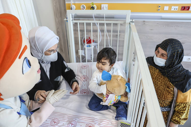 Cumhurbaşkanı Erdoğan'ın eşi Emine Erdoğan, Etlik Şehir Hastanesinde tedavi gören kanser hastası çocukları, TRT Çocuk'ta yayınlanan çizgi film kahramanlarının maskotlarıyla ziyaret ederek moral verdi.