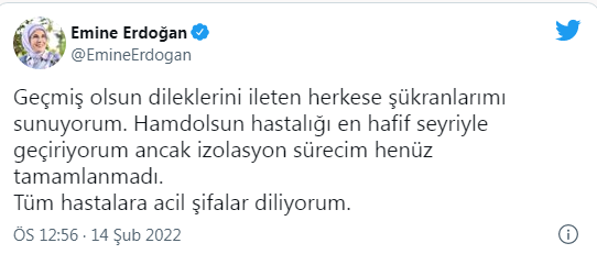 Emine Erdoğan, "Geçmiş olsun dileklerini ileten herkese şükranlarımı sunuyorum. Hamdolsun hastalığı en hafif seyriyle geçiriyorum ancak izolasyon sürecim henüz tamamlanmadı. Tüm hastalara acil şifalar diliyorum." dedi.