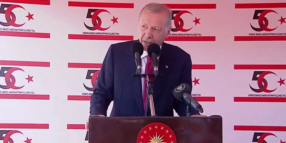 Kıbrıs Türk halkının özgürlüğe kavuşmasını sağlayan Barış Harekatı'nın 50. yıl dönümünde sizlerle beraber olmanın bahtiyarlığını yaşıyorum. 85 milyonun selam ve sevgilerini özellikle iletmek istiyorum. Bizleri bağrınıza bastığınız için her birinize ayrı ayrı teşekkür ediyorum. Vatan için, bayrak için, istiklal ve istikbalimiz için toprağa düşen yiğitlerin aziz ruhları şad olsun. Kıbrıs Türk'ünün hakları ve hürriyetleri için cesaretle savaşan gazilerimizin her birinin ellerinden öpüyor, şükranlarımı sunuyorum. Kıbrıs Barış Harekatı'nın mimarları olan Bülent Ecevit'i, Necmettin Erbakan'ı, Alparslan Türkeş ile diğer devlet ve siyaset adamlarımızı rahmetle anıyorum.