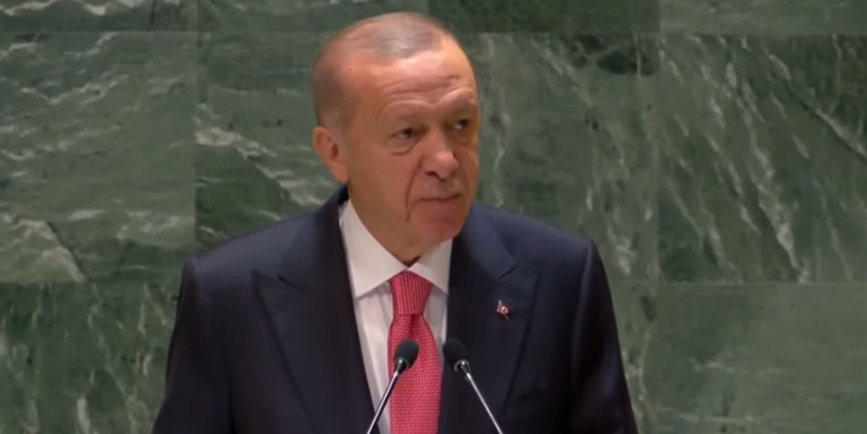 1967 sınırları çerçevesinde bağımsız, egemen bir Filistin devletinin kurulması artık ertelenemez. İlk kıblemiz Mescid-i Aksa ve Harem-i Şerif'e yönelik saldırıları da yakından takip ediyoruz. Tüm bunları söylerken Tayyip Erdoğan olarak bu kürsüde hamasetin diliyle konuşmuyorum. Burada tarihimden, ecdadımın vicdanlı duruşundan aldığım cesaretle konuşuyorum. Biz, tarih boyunca daima mazlumun yanında, zalimin ve zulmün karşısında olmuş bir milletiz.
