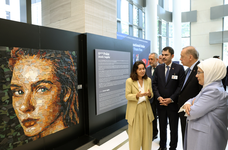 Sanatçı Deniz Sağdıç'tan eserler hakkında bilgi alan Cumhurbaşkanı Erdoğan, pil, ilaç, plastik, tekstil, şişe kapakları ve elektronik eşya gibi çok farklı atıklardan tasarlanan tabloları etkileyici bulduğunu söyledi. Erdoğan, sanatçıya yürüttüğü çevreci çalışmalarında başarı diledi.