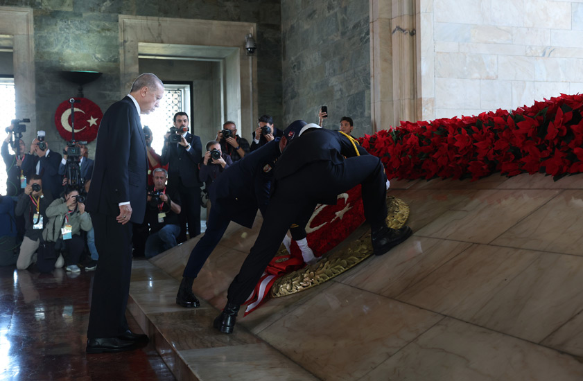 Cumhurbaşkanı Erdoğan'ın Aslanlı Yol'un başındaki yerini almasının ardından başlayan törende, Türkiye Büyük Millet Meclisi Başkanı Numan Kurtulmuş, Cumhurbaşkanı Yardımcısı Cevdet Yılmaz, CHP Genel Başkanı Kemal Kılıçdaroğlu, MHP Genel Başkanı Devlet Bahçeli, İYİ Parti Genel Başkanı Meral Akşener, Cumhurbaşkanlığı Kabinesi üyeleri, yüksek yargı organlarının başkanları, Genelkurmay Başkanı Orgeneral Metin Gürak ve kuvvet komutanları da Aslanlı Yol'dan geçerek mozoleye çıktı.