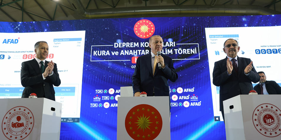Hatay’da ve diğer deprem şehirlerinde, yeni yerleşim yerlerinin inşası ve yerinde dönüşümle tüm hak sahiplerinin evlerine veya iş yerlerine kavuşmasını sağlayacaklarını belirten Cumhurbaşkanı Erdoğan, sözlerini şöyle sürdürdü: “Bu hususta vatandaşlarımız müsterih olsun, devletlerine ve bize güvensin. Kimsenin hakkı yerde kalmayacak, kimse mağdur olmayacak. Karşılıklı anlayışla, sabırla, gayretle, dayanışmayla üstesinden gelemeyeceğimiz hiçbir mesele yoktur. Esasen, deprem bölgesindeki şehirlerimizde sadece konut ve iş yeri yapmakla kalmıyoruz. Bu şehirlerimizin meydanlarını ve ana caddelerini, tarihî ve kültürel dokularına uygun şekilde yeniden düzenliyoruz.”