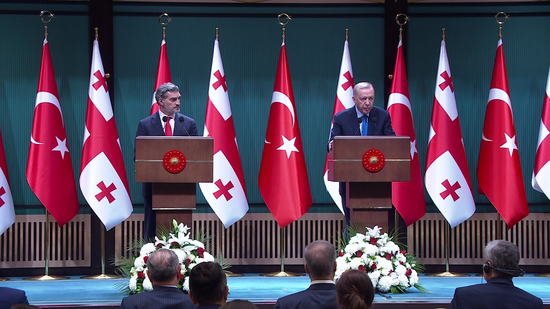 Cumhurbaşkanı Erdoğan, Cumhurbaşkanlığı Külliyesi'nde Gürcistan Cumhurbaşkanı Mikheil Kavelashvili ile ortak basın toplantısı düzenledi.