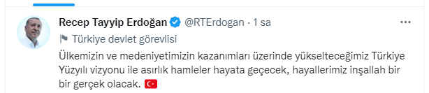 Cumhurbaşkanı Erdoğan, saat 20.23'te yaptığı paylaşımda, "Ülkemizin ve medeniyetimizin kazanımları üzerinde yükselteceğimiz Türkiye Yüzyılı vizyonu ile asırlık hamleler hayata geçecek, hayallerimiz inşallah bir bir gerçek olacak." ifadelerine yer verdi.