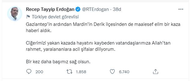 Cumhurbaşkanı Erdoğan, Mardin Derik'teki trafik kazasında yaşamını yitirenlere Allah'tan rahmet, yaralılara acil şifa diledi.