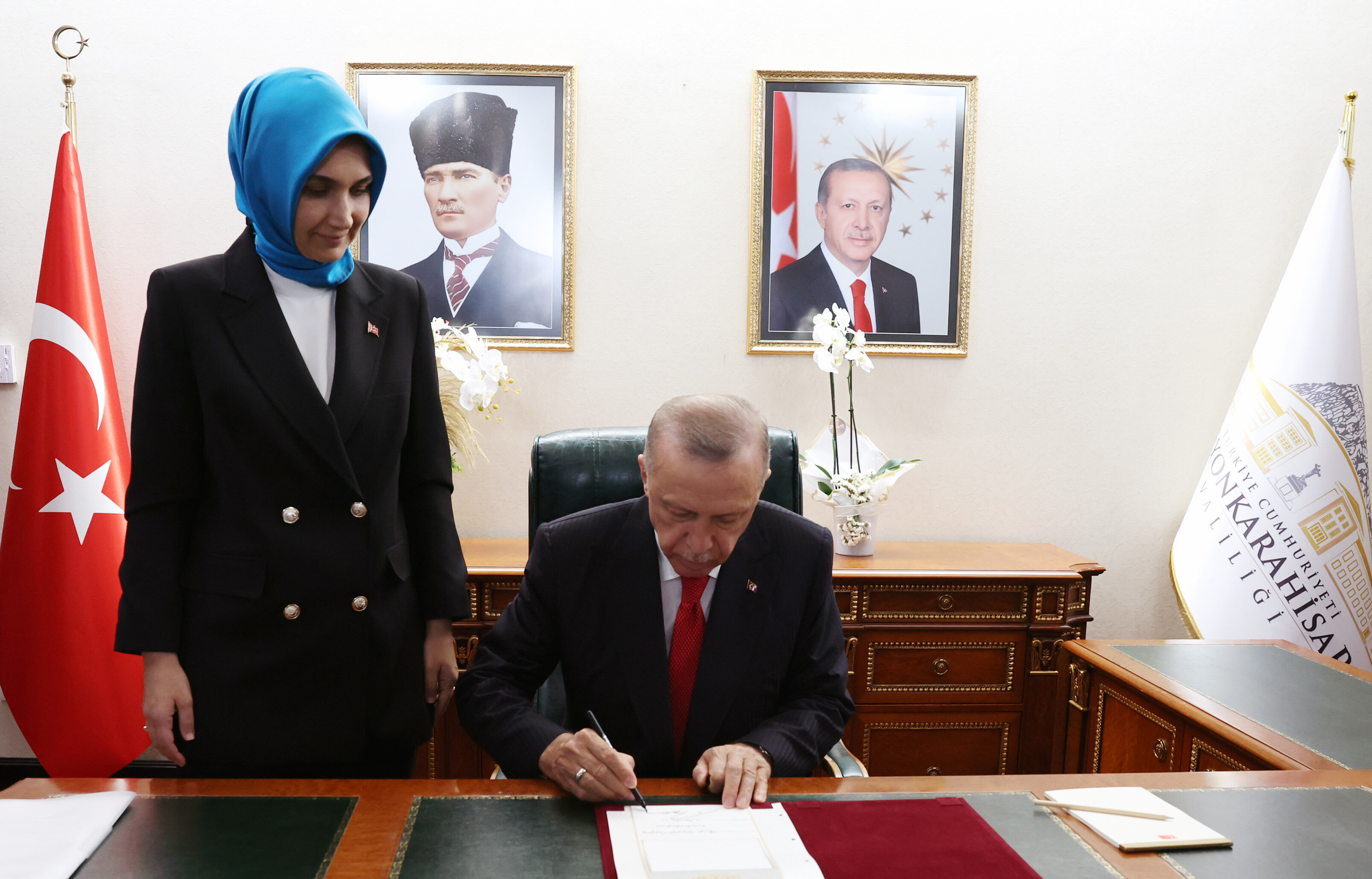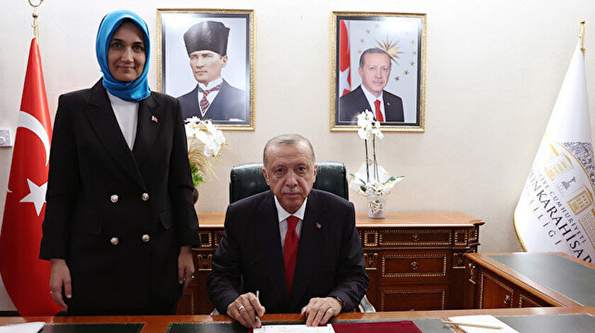 Valilik girişinde tören mangasını selamlayan Cumhurbaşkanı Erdoğan, Türkiye'nin ilk başörtülü valisi olan Kübra Güran Yiğitbaşı tarafından karşılandı.