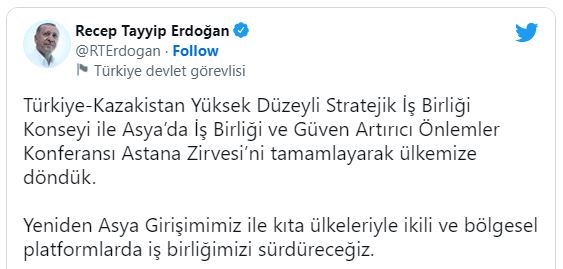 Erdoğan paylaşımında, "Türkiye-Kazakistan Yüksek Düzeyli Stratejik İş Birliği Konseyi ile Asya'da İş Birliği ve Güven Artırıcı Önlemler Konferansı Astana Zirvesi'ni tamamlayarak ülkemize döndük. Yeniden Asya Girişimimiz ile kıta ülkeleriyle ikili ve bölgesel platformlarda iş birliğimizi sürdüreceğiz." ifadelerini kullandı.