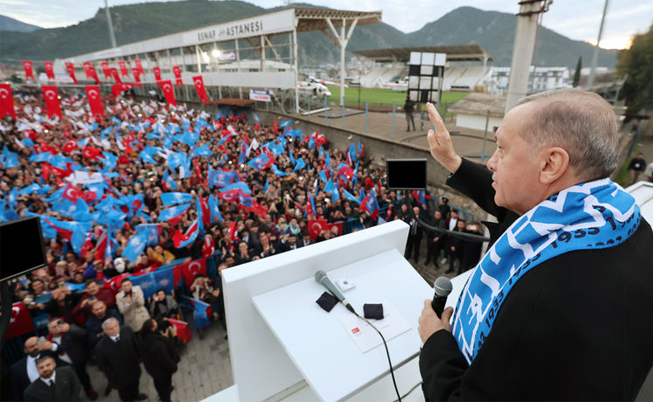 Erdoğan, "Adına 'Türkiye Yüzyılı' vizyonu dediğimiz bu kutlu mücadelede desteği yine sizlerden bekliyoruz. Artık sandık önümüze geliyor. Hazır mıyız? Artık Fethiye'de, Muğla'da sandıkları patlatmaya var mıyız?" şeklinde konuştu.