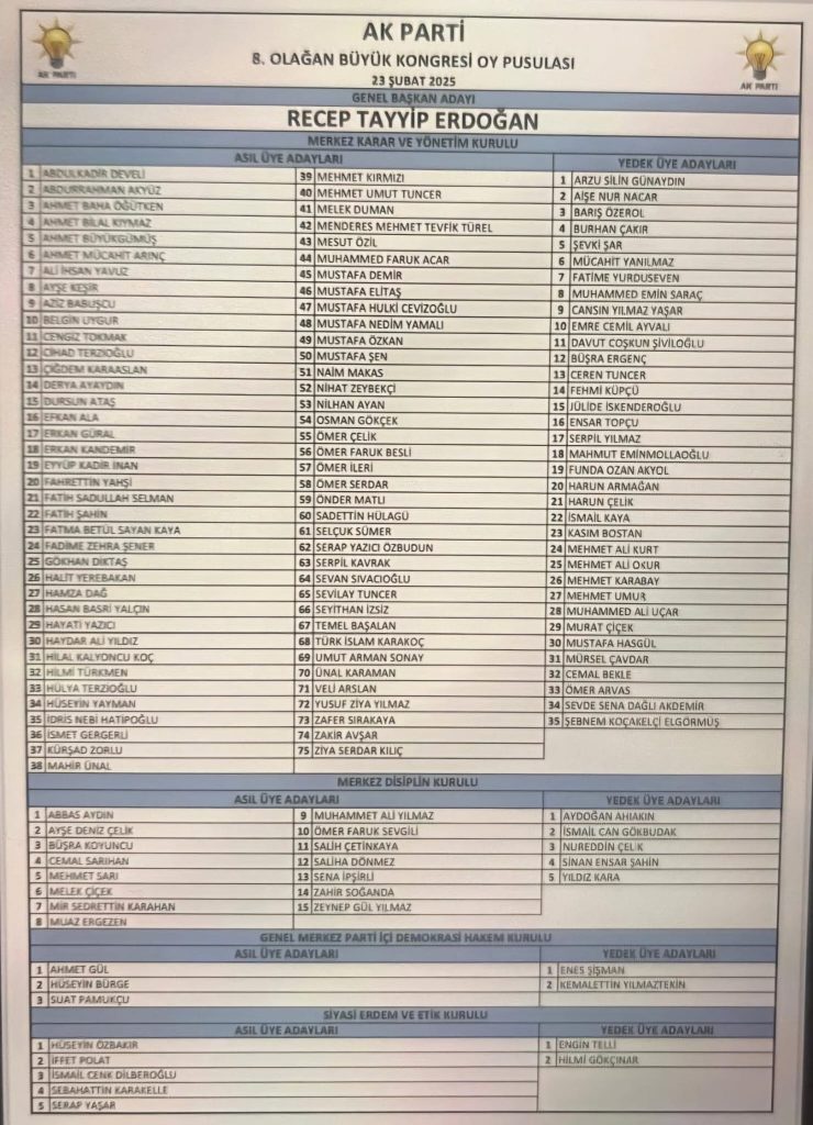 AK Parti'nin Merkez Karar ve Yönetim Kurulu, Merkez Disiplin Kurulu, Parti içi Demokrasi Hakem Kurulu ile Siyasi Erdem ve Etik Kurulu da belli oldu.