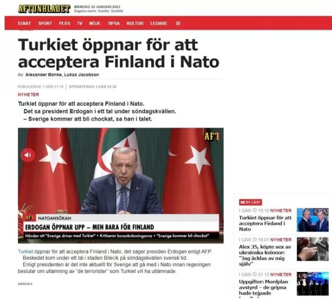 İsveç'in en çok okunan gazetelerinden Aftonbladet, Cumhurbaşkanı Erdoğan'ın bu sözlerini "Türkiye, Finlandiya'yı NATO'ya kabul etmeye hazır" diyerek okuyucularına sundu. Stockholm Üniversitesi Türkiye Araştırmaları Enstitüsü Başkanı Türkiye uzmanı Paul Levin'i 'Erdoğan ilk kez bu kadar net konuştu' ifadelerine haberinde yer verdi.