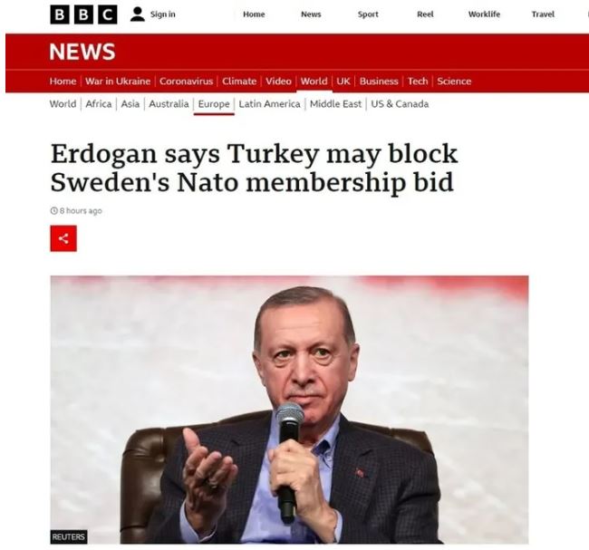 BBC'de yer alan haberde ise," Erdoğan, Türkiye'nin İsveç'in NATO üyeliğini engelleyebileceğini söyledi" ifadeleri kullanıldı. Haberde, Erdoğan'ın, "Eğer kesinlikle NATO'ya katılmak istiyorsanız, bu teröristleri bize geri vereceksiniz" sözlerine dikkat çekildi.