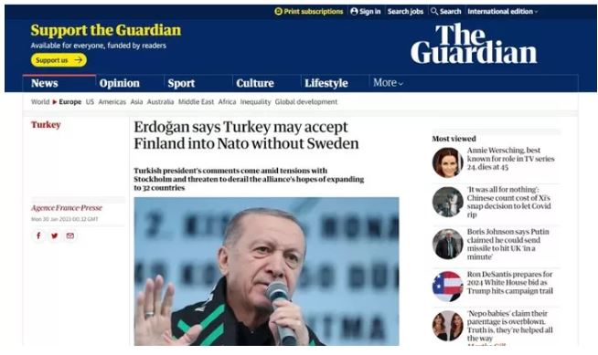 The Guardian'da ise skandal ifadelere başvuruldu. "Erdoğan, Türkiye'nin İsveç olmadan Finlandiya'yı NATO'ya kabul edebileceğini söyledi" başlığı ile verilen haberde, Türkiye'nin ittifakın 32 ülkesinin genişleme umutlarını rayından çıkarmakla tehdit ettiği ileri sürüldü.