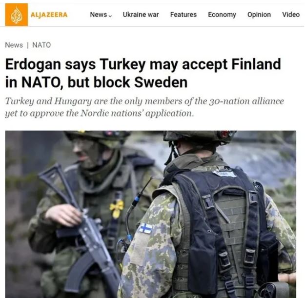 Al Jazeera'daki haberde ise," Erdoğan, Türkiye'nin Finlandiya'yı NATO'ya kabul edebileceğini ancak İsveç'i engelleyebileceğini söyledi" denildi. Türkiye ve Maceristan'ın İsveç ve Fİndandiya'nın NATO üyeliğini onaylamayan iki ülke olduğu hatırlatıldı.