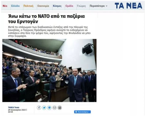 Yunan Ta Nea da yer alan haberde, 'Erdoğan'ın pazarlıkları ifadesi kullanıldı." İsveç'in katılım prosedürlerini 'dondurmasının' ardından, Erdoğan,, oyunu ikiye "kırma" olasılığını açık bırakarak Finlandiya'nın İttifaka katılmasına izin verdi." denildi.