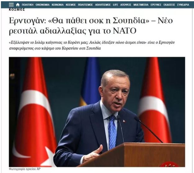 Yunanistan'ın Kathimerini gazetesinde ise, "NATO için yeni uzlaşmazlık resitali" ifadeleri kullanıldı. Haberde, "İsveç'te Kuran'ın yakılmasına atıfta bulunan Erdoğan, "Ne kadar şerefsiz olduklarını gösterdiler" dedi." ifalereri yer aldı.