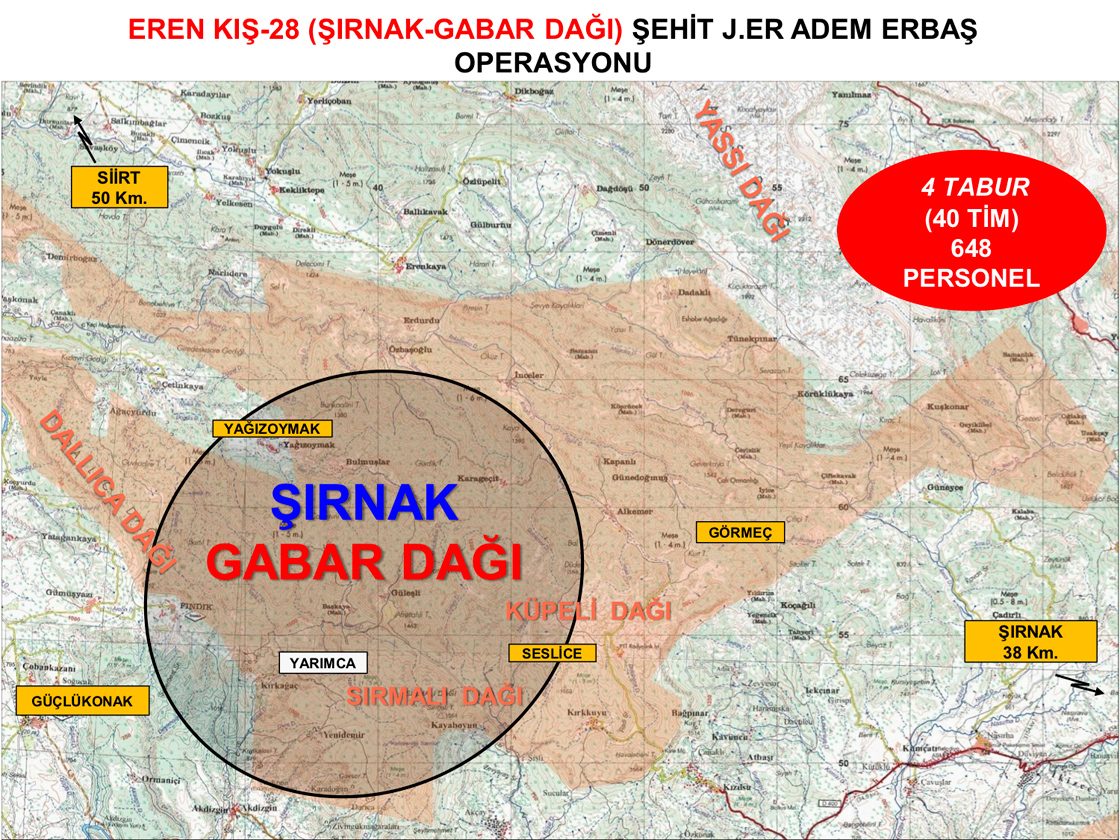 Bakanlıktan yapılan açıklamaya göre, PKK terör örgütünü ülke gündeminden çıkarmak ve bölgede barındığı değerlendirilen teröristleri etkisiz hale getirmek maksadıyla Şırnak'ta "Eren Kış-28 (Şırnak-Gabar Dağı) Şehit Jandarma Er Adem Erbaş Operasyonu" başlatıldı.