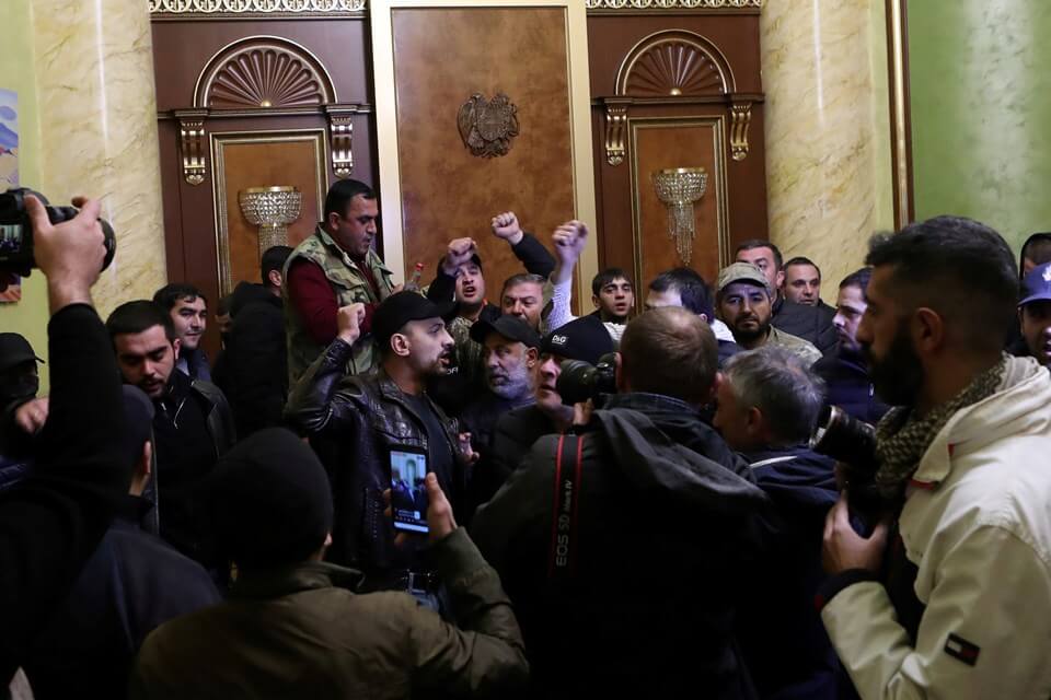 Başkent Erivan'da ayaklanan protestocular önce Özgürlük Meydanı'nda bir araya geldi. Başbakan Paşinyan'ın Azerbaycan'a karşı yenilgiyi kabul etmesine büyük tepki gösteren protestocular hükümeti istifaya davet etmekle kalmayıp hükümet binasını bastı, hatta Paşinyan'ın evi bile yağmalandı. Bununla birlikte muhalefet partileri, Başbakan Paşinyan'ın istifa etmesi için dün gece yarısına kadar süre tanıyarak ültimatom verdi.