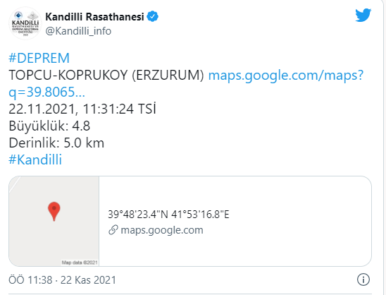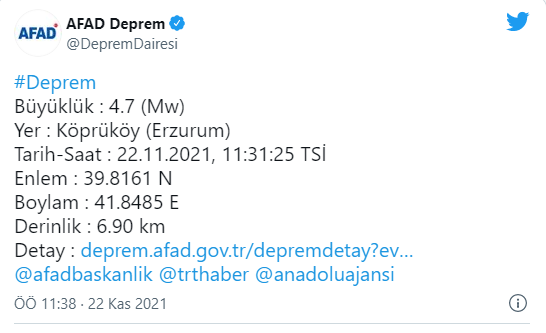AFAD verilerine göre saat 11.31'de merkez üssü Erzurum Köprüköy olan 4.7 büyüklüğünde bir deprem meydana geldi.