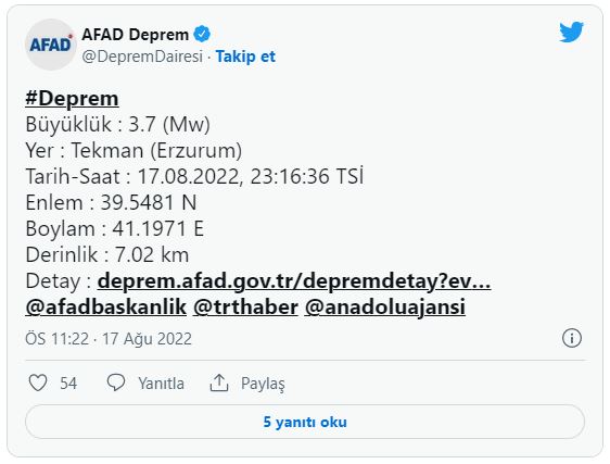 Erzurum'da korkutan deprem!Erzurum'un Tekman ilçesinde 3.7 büyüklüğünde deprem meydana geldi.18 Ağustos 2022, Perşembe - 00:10 Erzurum'un Tekman ilçesinde 3.7 büyüklüğünde deprem meydana geldi.AFAD Twitter hesabından bir paylaşım yaparak Erzurum'un Tekman ilçesinde 3.7 büyüklüğünde deprem meydana geldiğini açıkladı.İsfalt'taki ihalelerde "hileli hareketler" iddiasıEtiketler: erzurum deprem