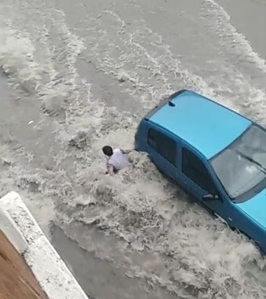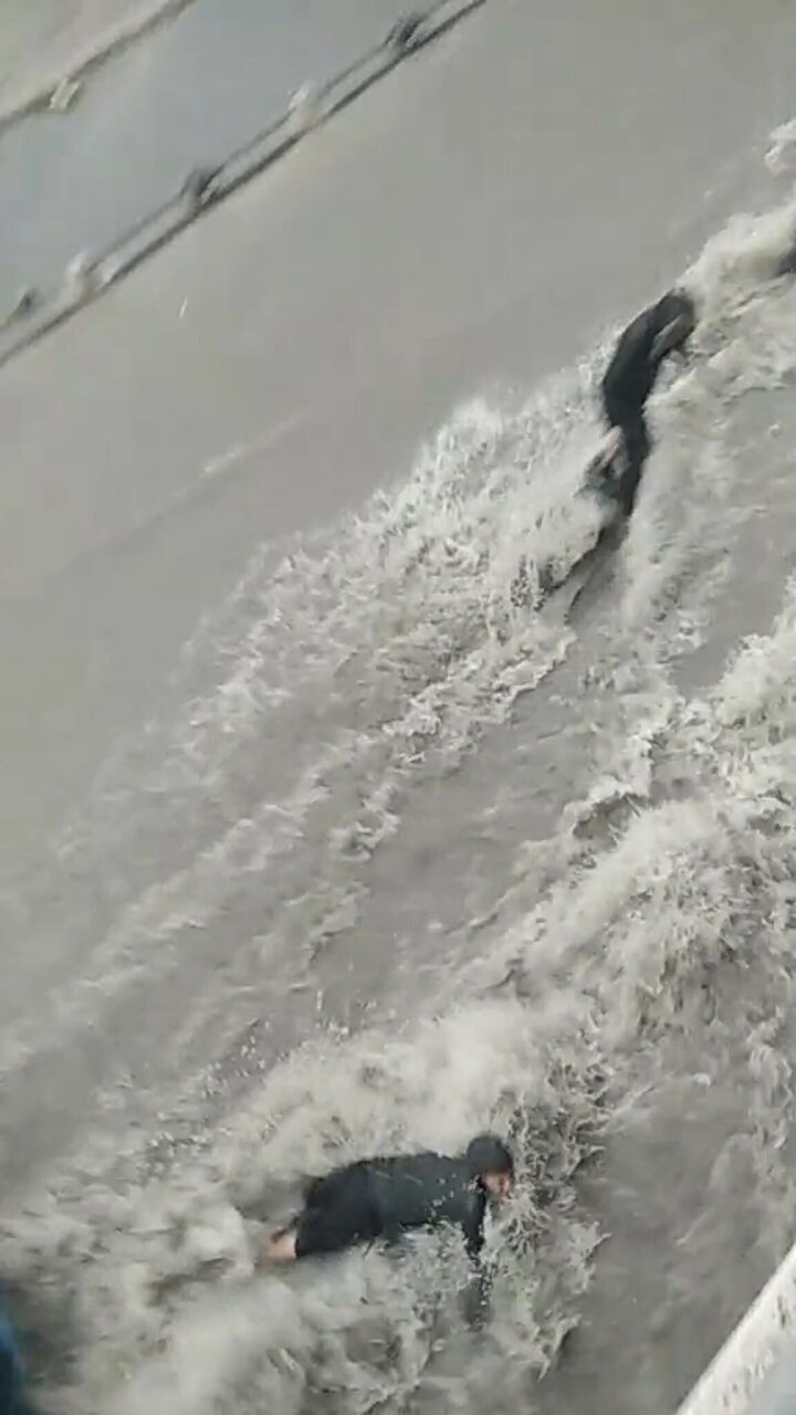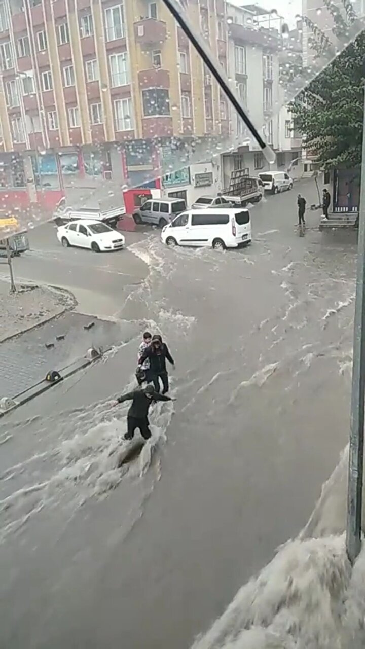 Akıntıya kapılan çocuk bir süre sürüklendikten sonra park halindeki otomobile tutundu. Bir binanın altında bekleyen kişi ise çocuğu koşarak yakaladı.