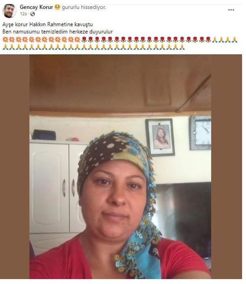 Gencay Korur, cinayetin ardından bir sosyal medya platformunda durum kısmında, ‘Gururlu hissediyor’ şeklinde yaptığı paylaşımda “Ayşe Korur Hakkın rahmetine kavuşmuştur. Ben namusumu temizledim, herkese duyurulur” ifadelerine yer verdi.